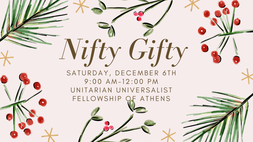 Nifty Gifty will be held on Saturday, December 6th from 9-12 PM. Nifty Gifty is an annual UUFA tradition when folx of all ages are invited to come make crafts and gifts for their loved ones.
