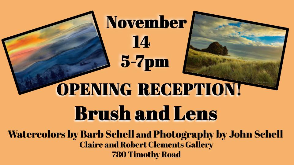 Enjoy beautiful art times two! Barb and John Schell share watercolors (hers) and photography (his) in UUFA’s Claire and Robert Clements Gallery, 780 Timothy Rd., through December. Come to the November 14 opening reception from 5 to 7 p.m. to meet the artists and view their work. Refreshments provided.