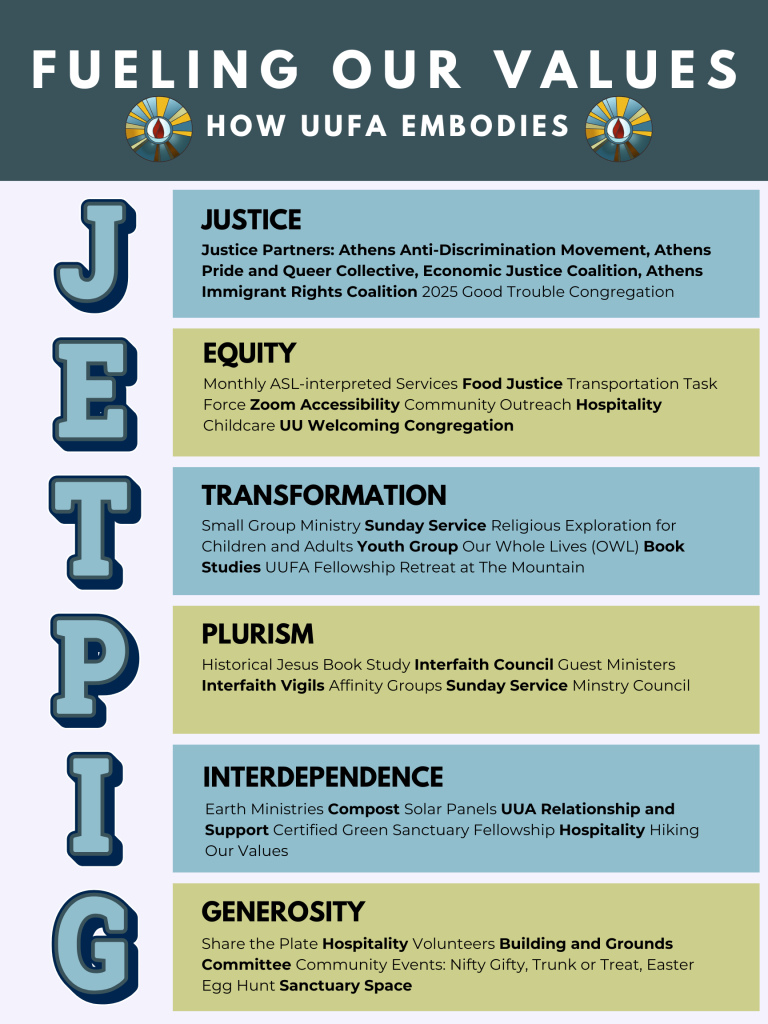Information on justice-focused meetings, events, and teams is available This Month & Beyond, but to see only justice meetings, you can find visuals announcements here & the UUFA Justice Calendar here