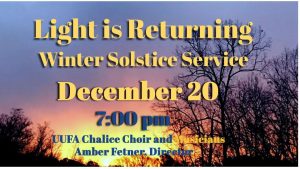 Come to the Fellowship on December 20 at 7 pm to celebrate “Light Is Returning” through music, reflection, and community in this special evening service featuring the Chalice Choir and musicians. Childcare will be available.