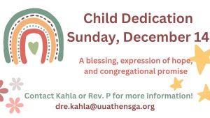 Do you want your child included in our next Child Dedication ceremony on December 14th? Email dre.kahla@uuathensga.org for more information.Â