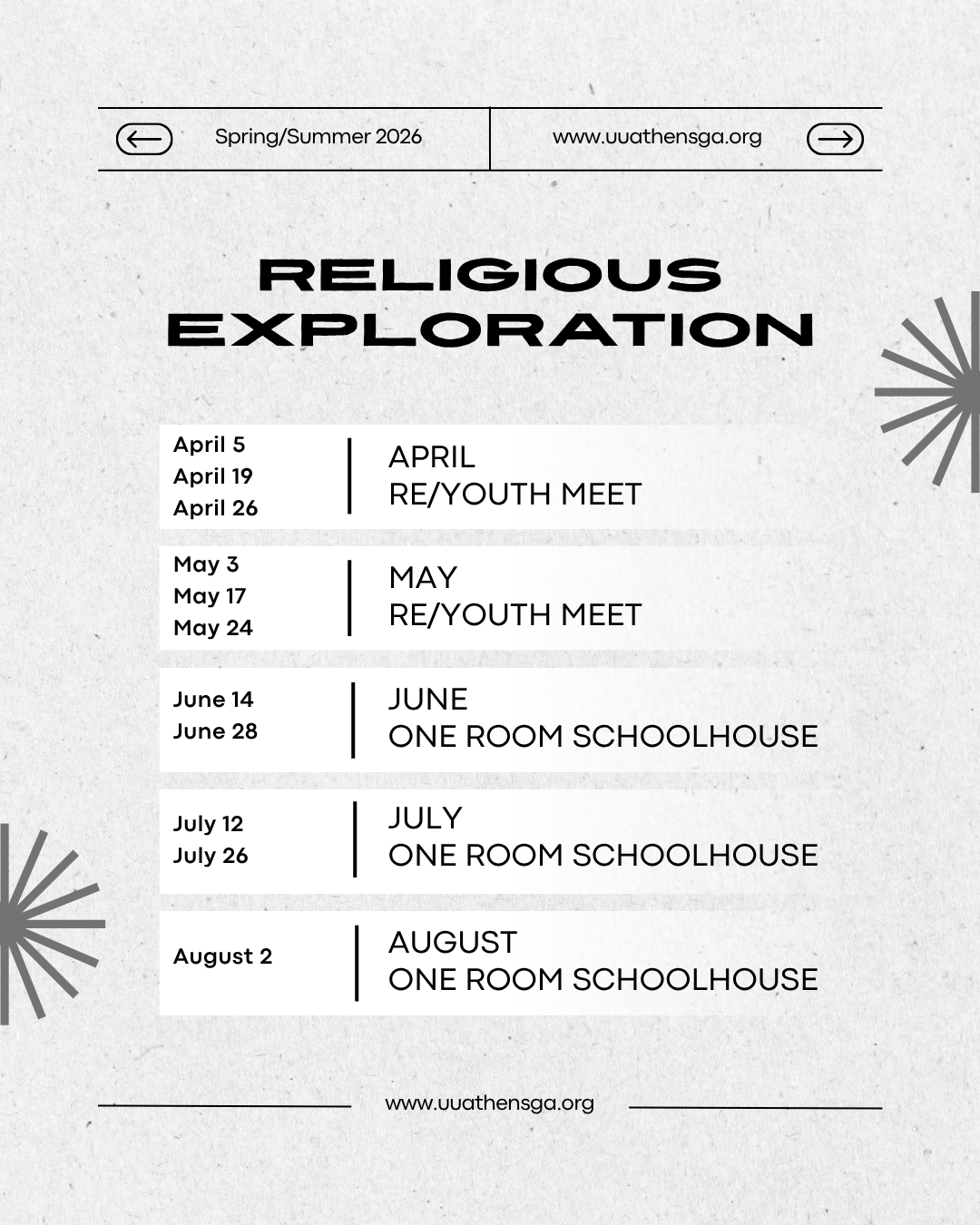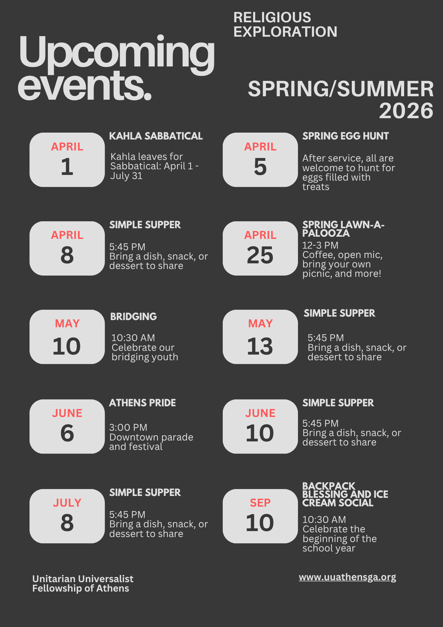 As the weeks before my sabbatical are quickly passing by, I want to share some information with you all about RE dates for the spring and summer as well as special events that will happen until August.
