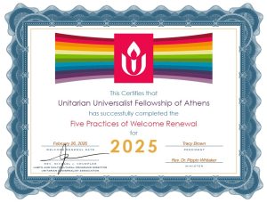 It was a pleasure to read about all you have accomplished and the powerful work you have done to ensure that UU Athens is meeting the needs of queer and trans congregants and the wider community in the following ways: